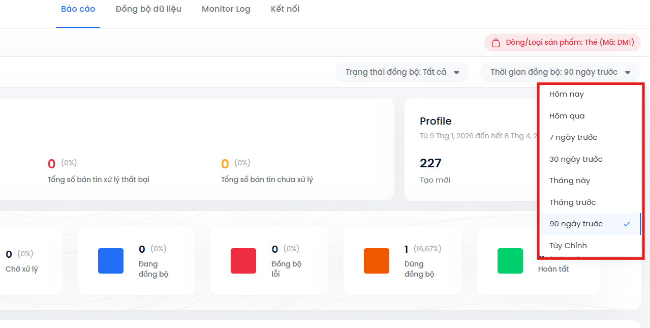 - Chọn thời gian đồng bộ: hôm nay, hôm qua, 7 ngày trước, 30 ngày trước, tháng này, tháng trước, 90 ngày trước hoặc tùy chỉnh.