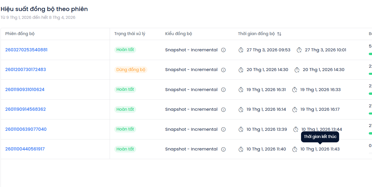 - Lợi ích/Giá trị: Giúp giám sát chất lượng đồng bộ, nhận diện phiên lỗi và theo dõi tiến độ snapshot/incremental.