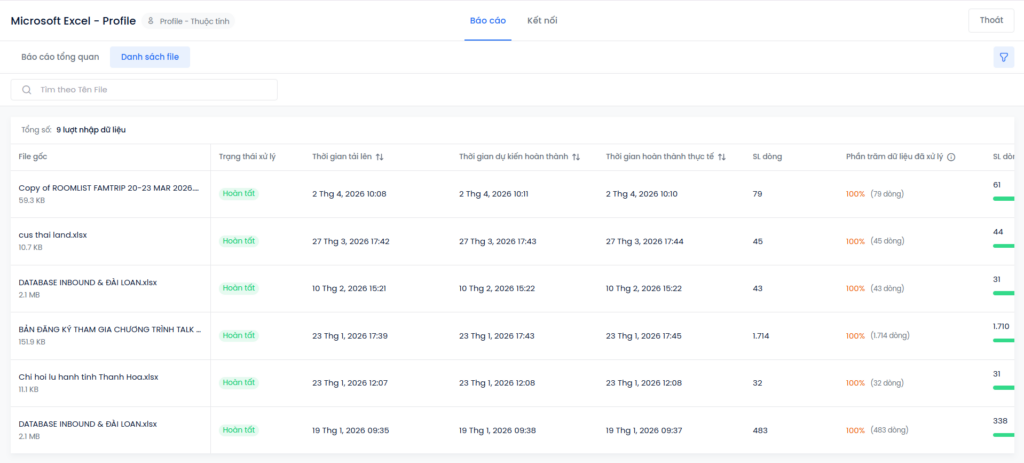 - Kiểm tra danh sách file với các cột: trạng thái xử lý, thời gian tải lên, thời gian hoàn thành dự kiến/thực tế, số dòng, phần trăm xử lý.