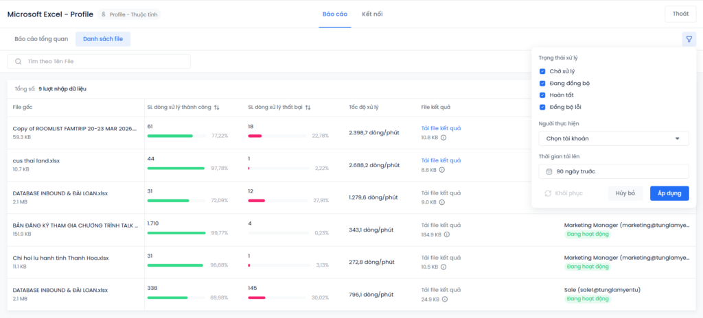 - Chỉ số chi tiết file: số dòng thành công, số dòng thất bại, tốc độ xử lý, file kết quả, người thực hiện.