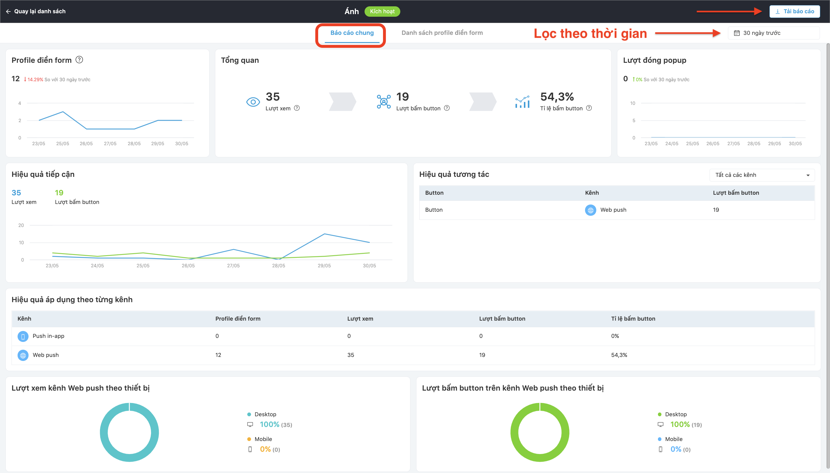 Báo cáo Popup giúp người dùng có cái nhìn Tổng quan và Hiệu quả từ các kênh, thông qua các chỉ số: profile điền form, lượt xem, lượt bấm button, tỉ lệ bấm button.