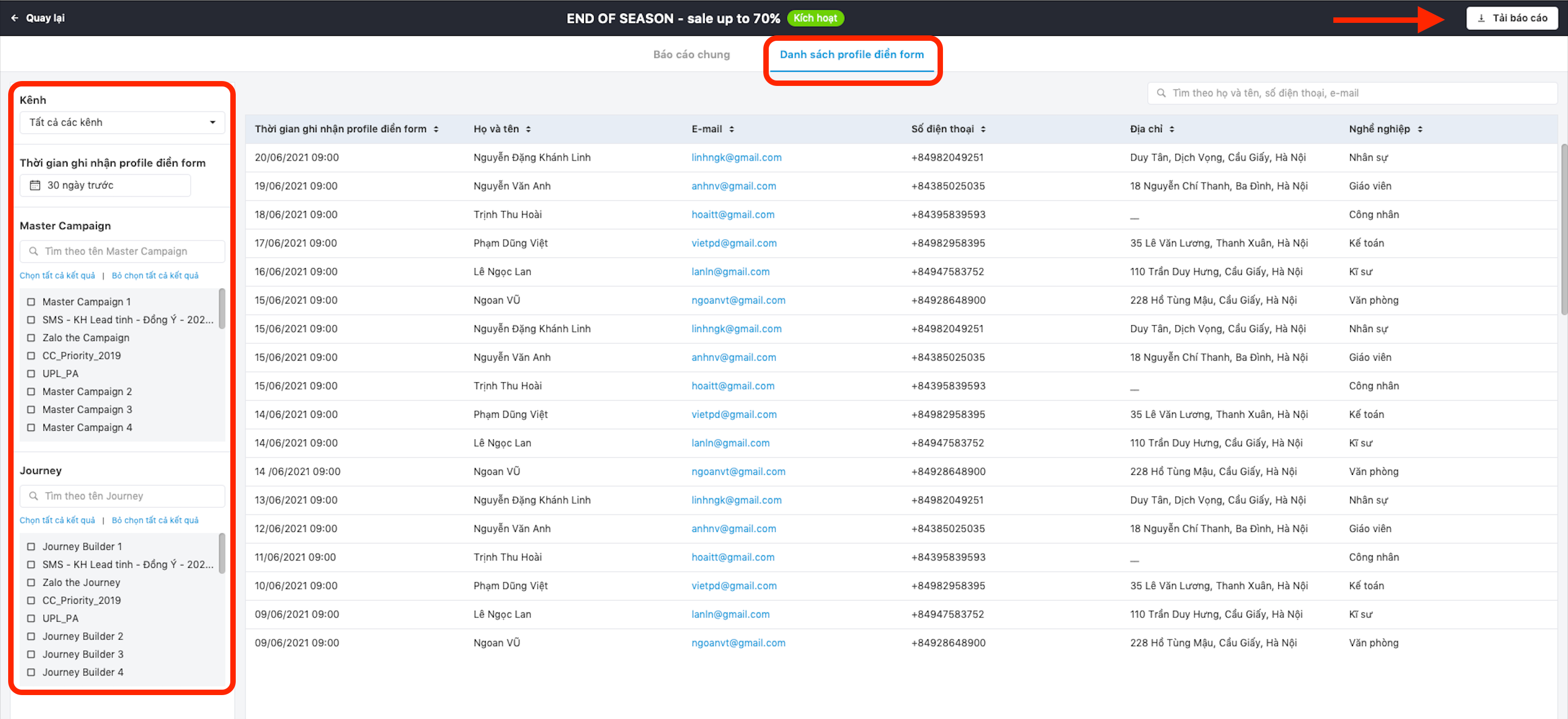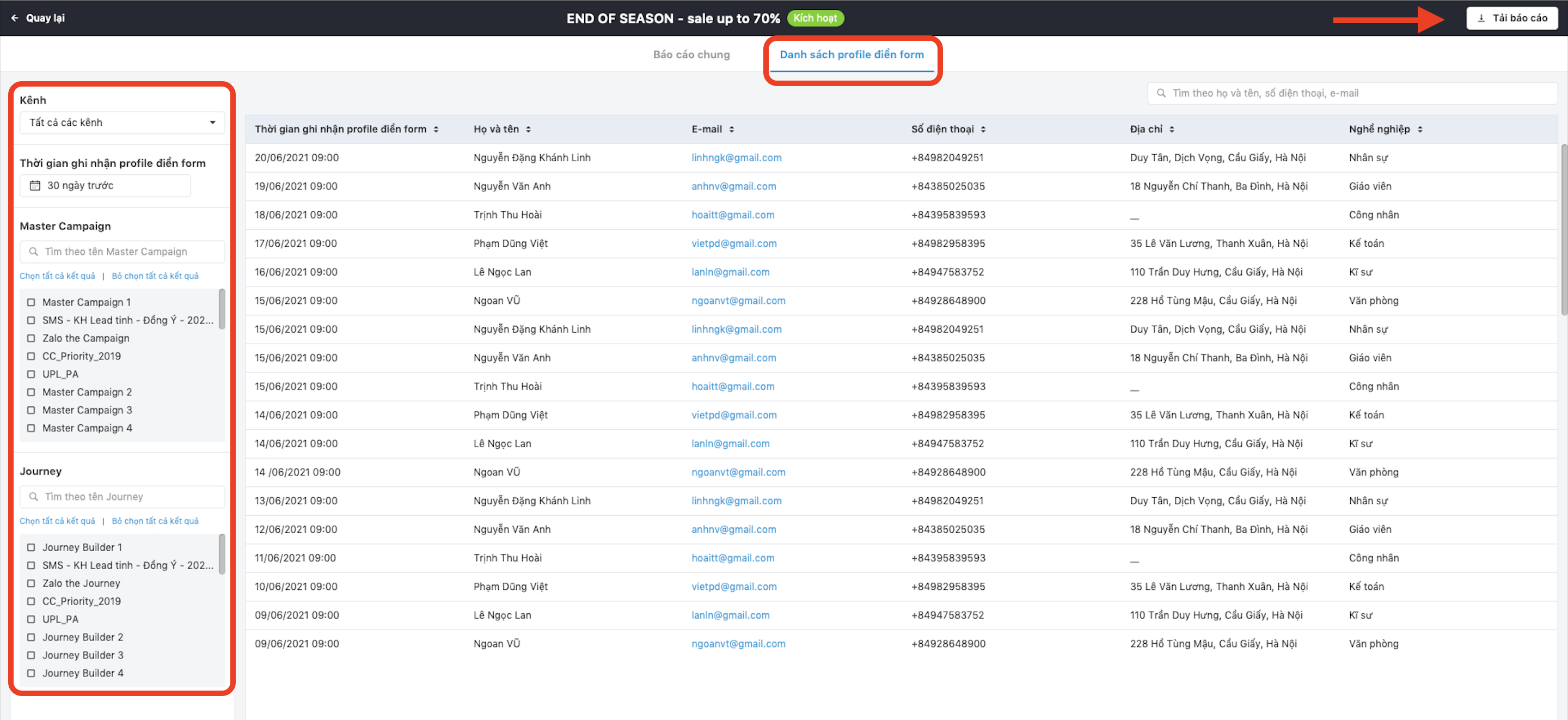 - Lọc thời gian ghi nhận profile điền form