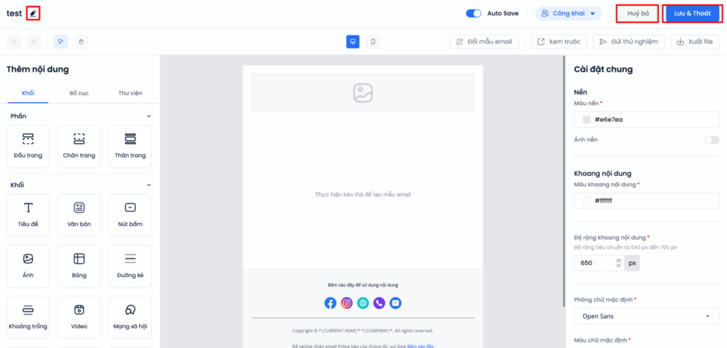 - Lợi ích: Chủ động linh hoạt tuỳ chỉnh giao diện Header, Body, Footer thông qua các thao tác kéo thả cấu trúc khối. Cho phép lưu trữ dễ dàng để tạo ra các template chiến dịch có tính ứng dụng cao.
