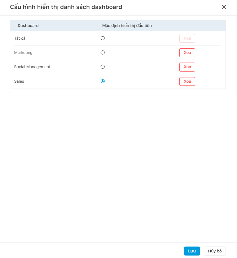 Ví dụ: Chọn Dashboard Tất cả làm hiển thị mặc định