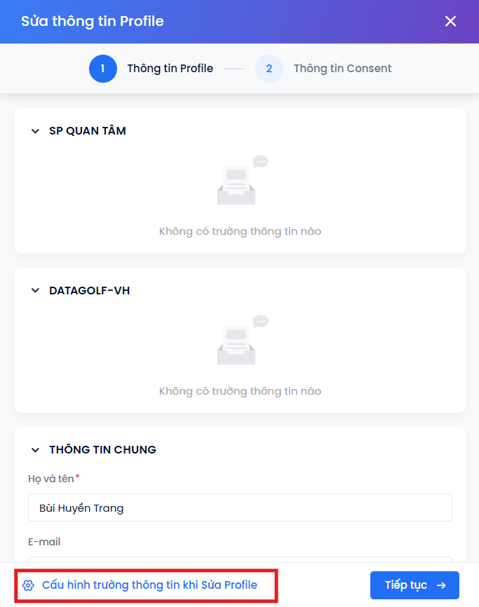 Nhấn Tiếp tục để cập nhật thông tin consent → Nhấn Lưu để hoàn tất cập nhật.