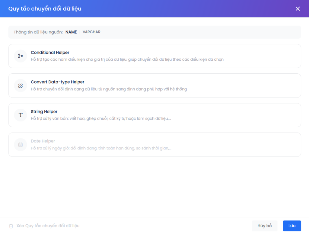 Lưu ý: Hệ thống tự động nhận diện kiểu dữ liệu của cột Nguồn và chỉ hiển thị các lựa chọn chuyển đổi hợp lệ.