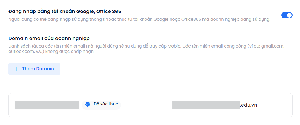 Domain doanh nghiệp: Tên miền email riêng của tổ chức (Ví dụ: mobio.io, mobiobank.com.vn). Hệ thống không chấp nhận các tên miền công cộng đại trà.