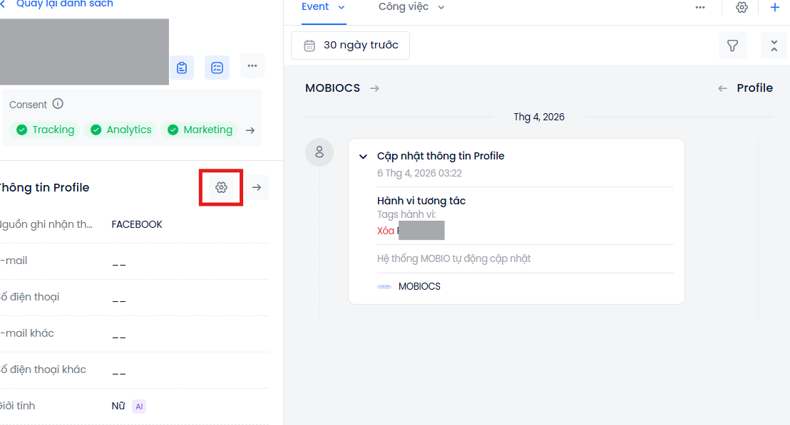Cột bên trái: Hiển thị thông tin cơ bản (Họ tên, SĐT, Email), trạng thái Consent (Tracking, Analytics, Marketing) và các thuộc tính nhân khẩu học. Các thông tin này có thể được cấu hình tùy chỉnh.