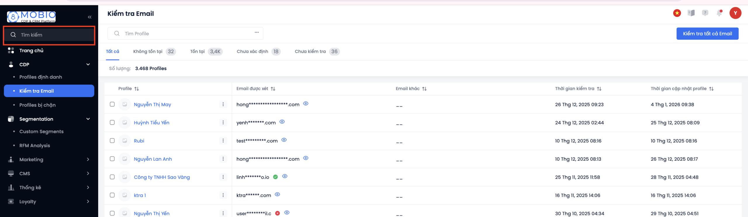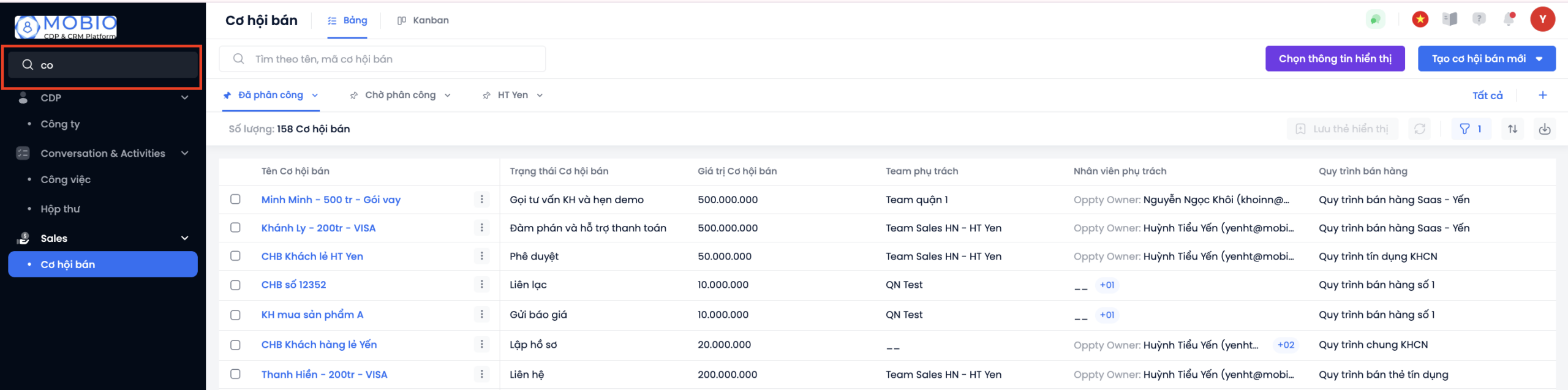 Để tối ưu hóa trải nghiệm và giúp người dùng thao tác nhanh chóng hơn, Mobio đã cập nhật tính năng Tìm kiếm trực tiếp ngay trên thanh menu. Thay vì phải duyệt qua từng danh sách phân cấp, giờ đây người dùng có thể truy cập bất kỳ tính năng nào chỉ với một vài phím gõ.