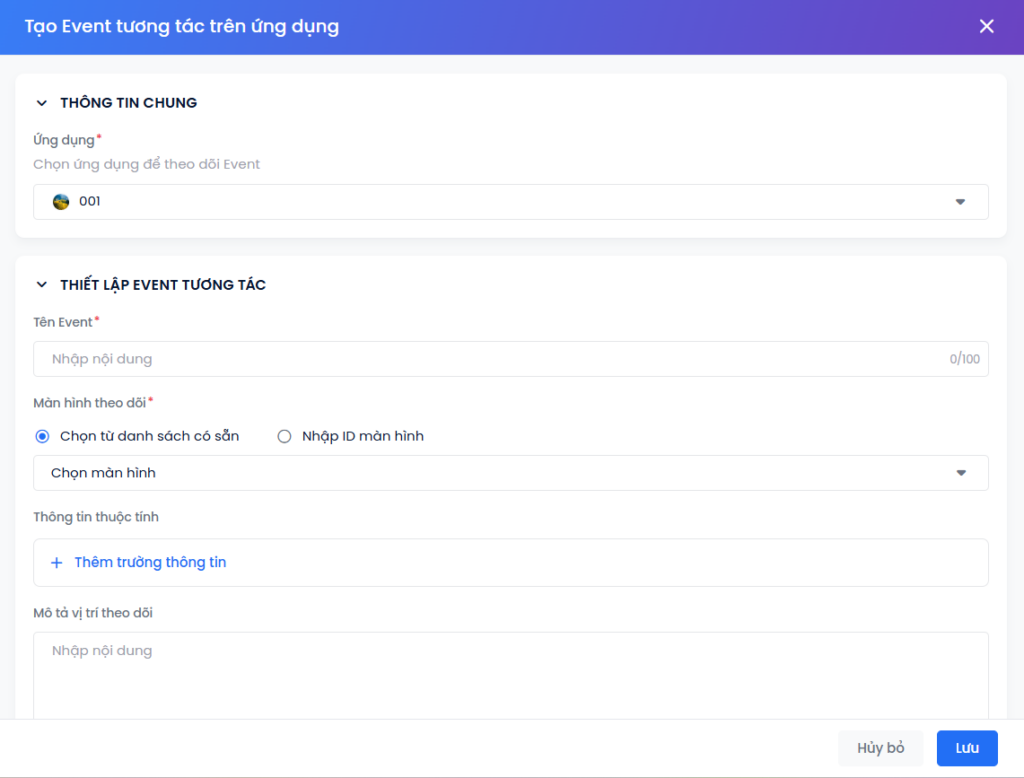- Bài viết trước: Khai báo ứng dụng & Lấy thông tin cấu hình. Bạn chỉ có thể tạo event tracking tùy biến khi ứng dụng đã được khai báo trên Mobio.