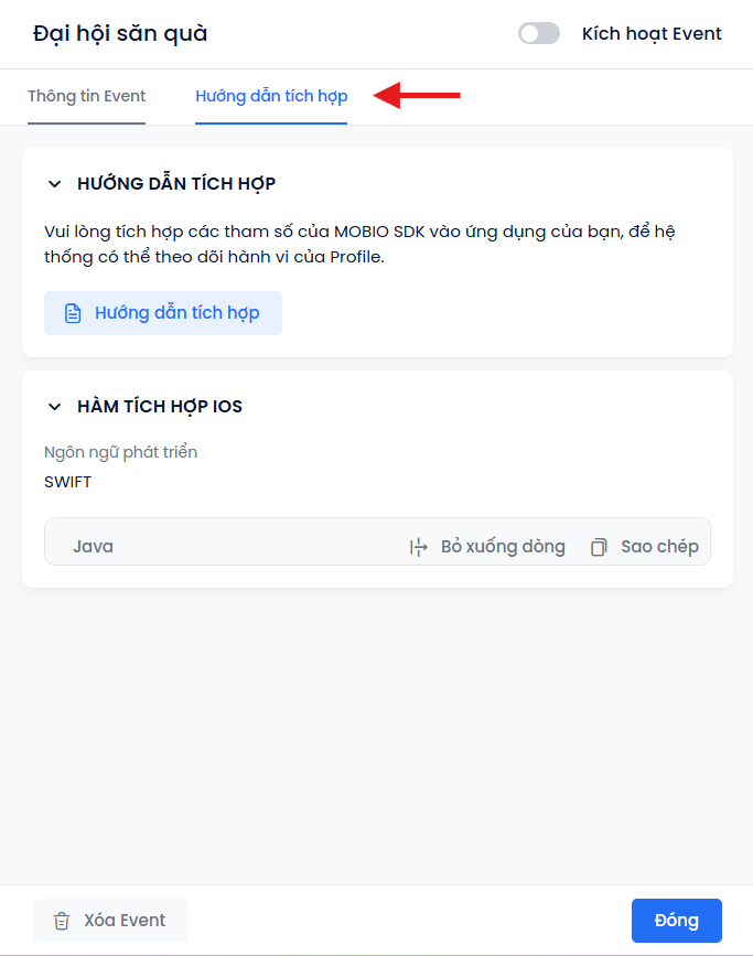 Khác với các hàm Định danh (Identify/Login) buộc Developer phải tự code, với tính năng Event Tracking, hệ thống Mobio tự động sinh ra trọn bộ code mẫu JSON/Swift/Java. Admin chỉ việc Copy đoạn mã đó gửi cho Lập trình viên Paste thẳng vào App.