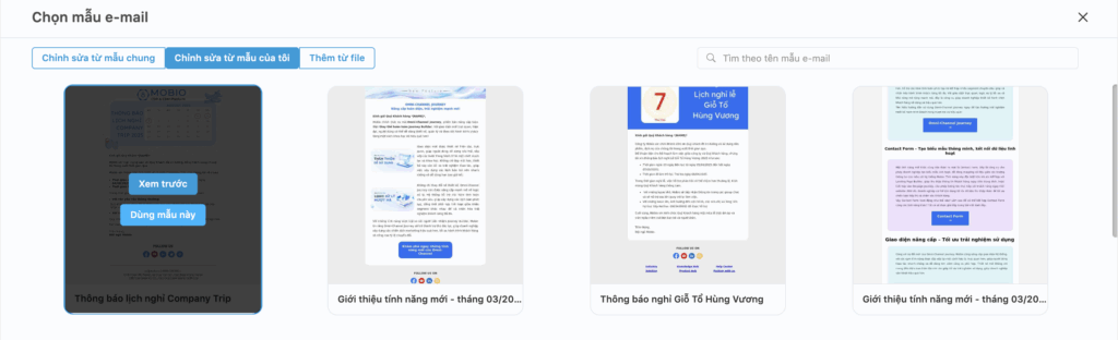 - Chọn mẫu email: Người dùng có thể tạo mới mẫu email, hoặc chọn mẫu email có sẵn từ Chỉnh sửa từ mẫu chung, Chỉnh sửa từ mẫu của tôi, hoặc Thêm từ file. Khi đã chọn được mẫu email mong muốn, ấn Dùng mẫu này.
