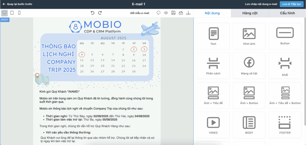Bước 4: Khi đã chỉnh sửa xong, ấn Lưu & Tiếp tục để hoàn tất thao tác tạo khối Email.