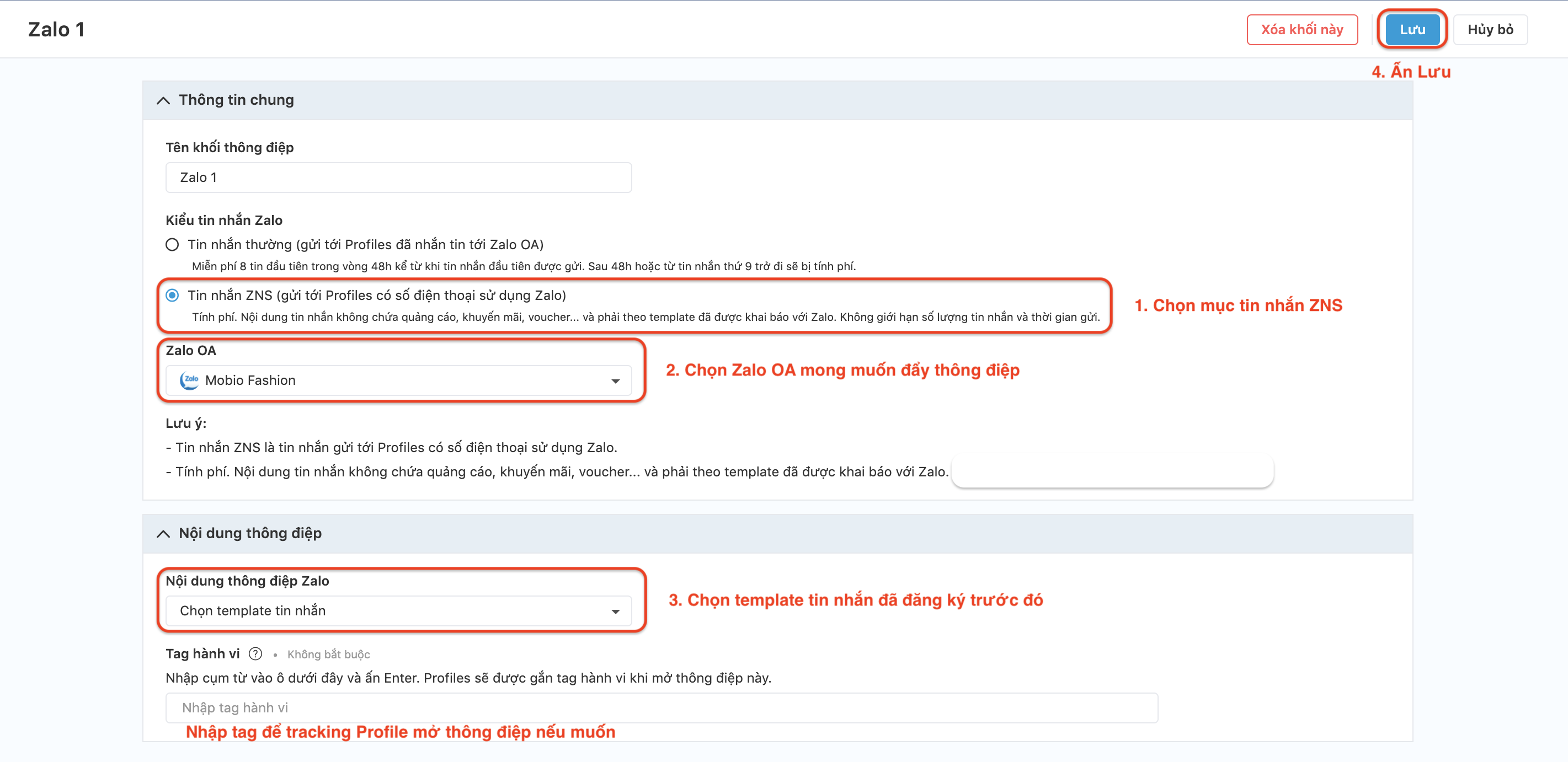 - Chọn template tin nhắn đã đăng ký từ trước.