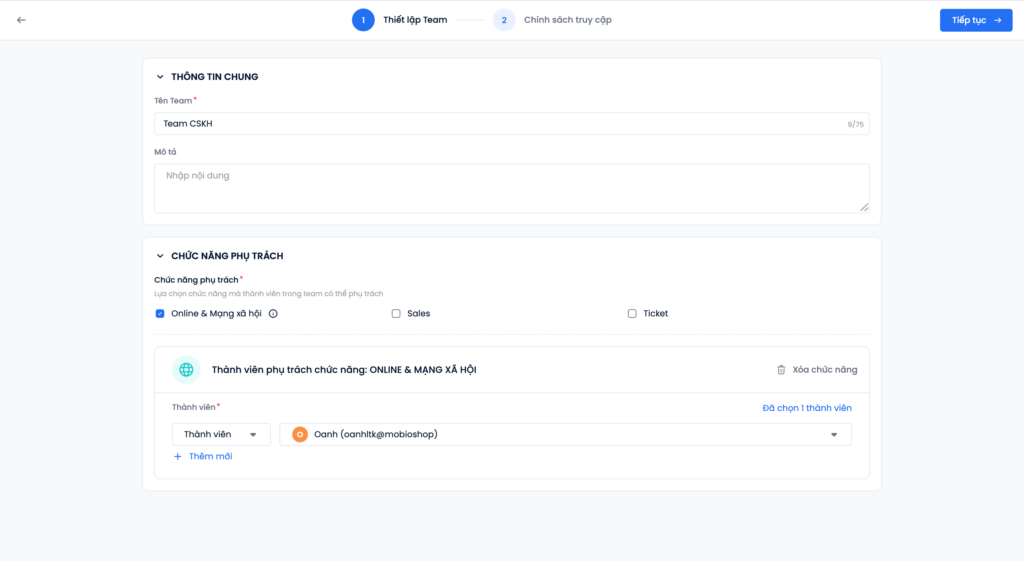 Lựa chọn Chức năng phụ trách (Online & Mạng xã hội, Sales, Ticket).