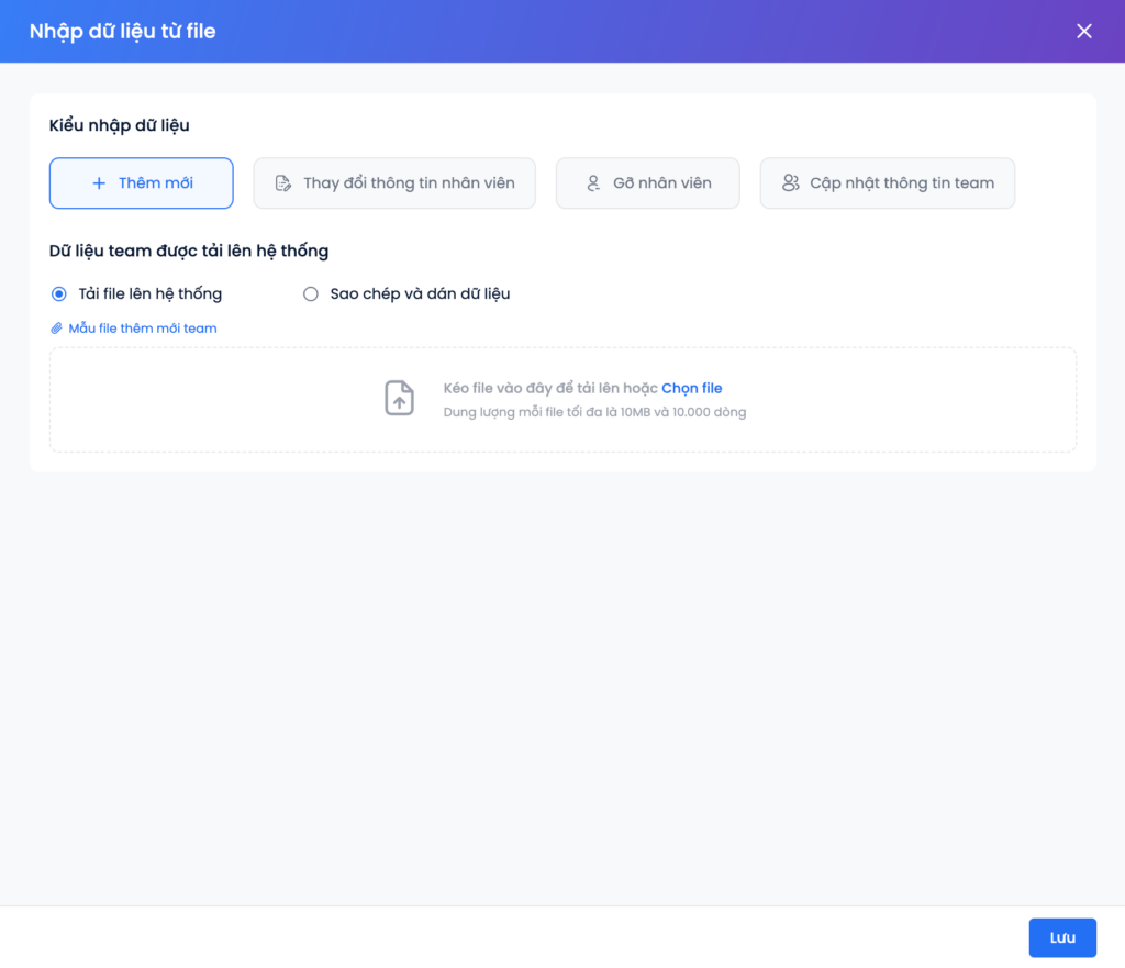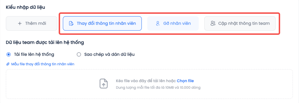 Chọn Kiểu nhập dữ liệu tương ứng (Thay đổi thông tin nhân viên, Gỡ nhân viên, Cập nhật thông tin team).