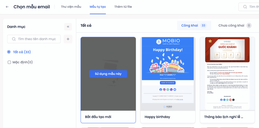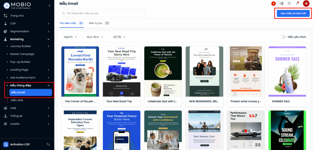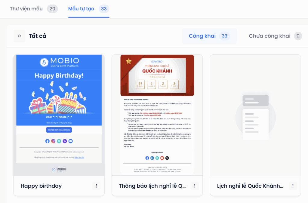 + Thư viện mẫu: Là những mẫu mà Mobio đã tạo sẵn, cho phép người dùng dựa trên mẫu có sẵn này, chỉnh sửa tạo mẫu email mới theo tùy chỉnh.