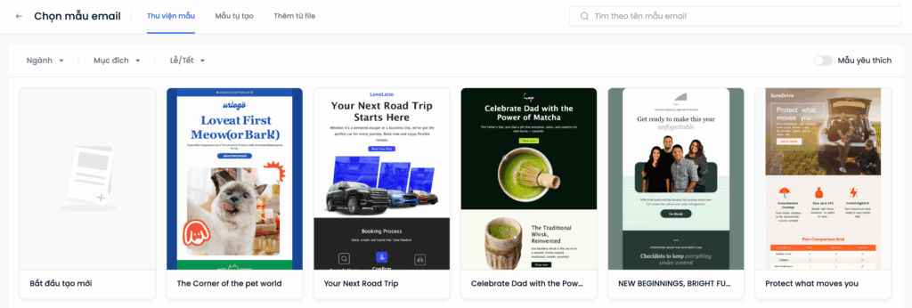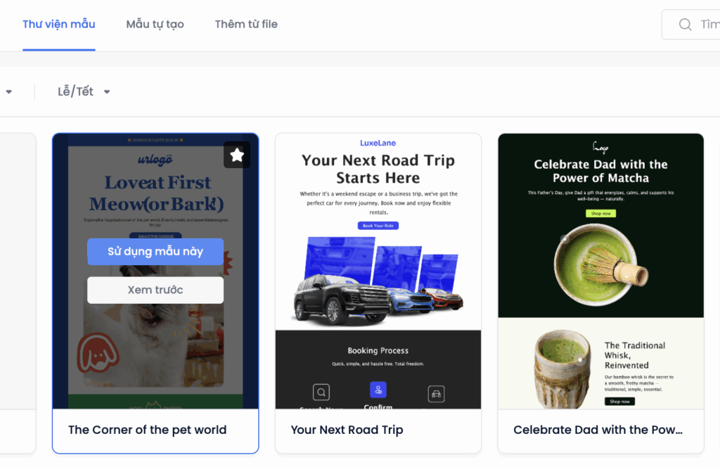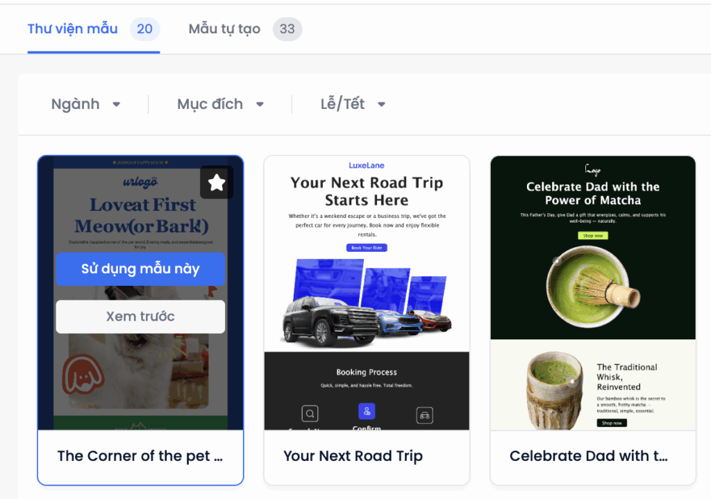 Người dùng có thể lựa chọn mẫu email mong muốn từ Thư viện email hoặc từ Mẫu tự tạo, và lựa chọn Sử dụng mẫu này.