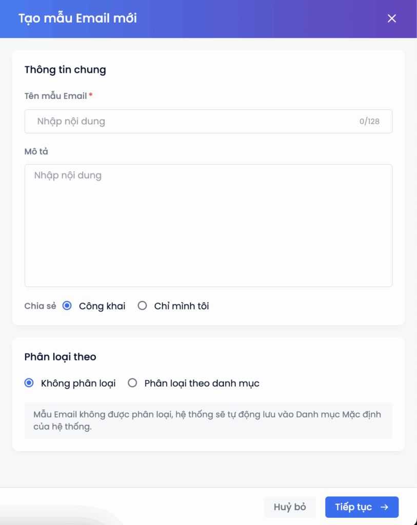 Màn hình sẽ hiển thị phần Thông tin chung, sau khi điền đủ thông tin, ấn Tiếp tục, giao diện hiển thị 3 lựa chọn Mẫu email như sau: