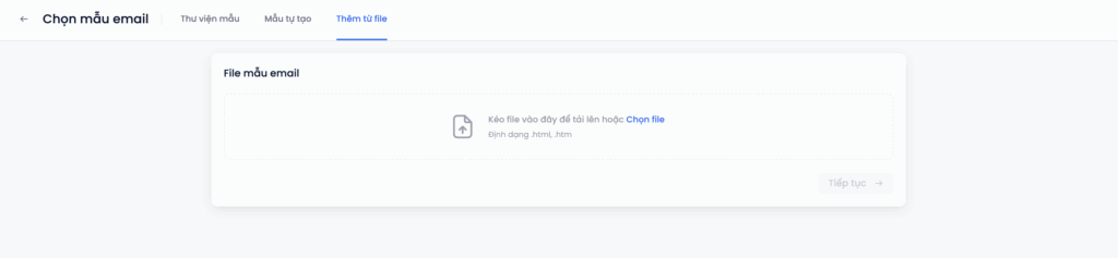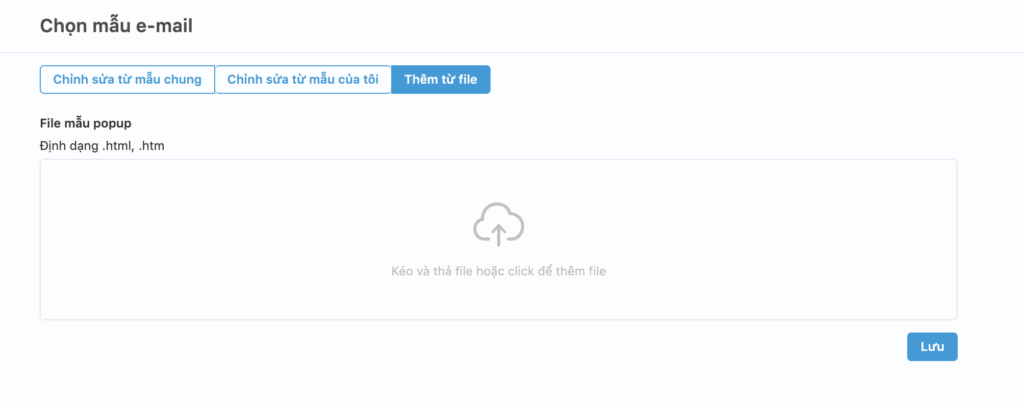 + Thêm từ file: Cho phép người dùng upload file mẫu email (dạng HTML) lên Email Builder.