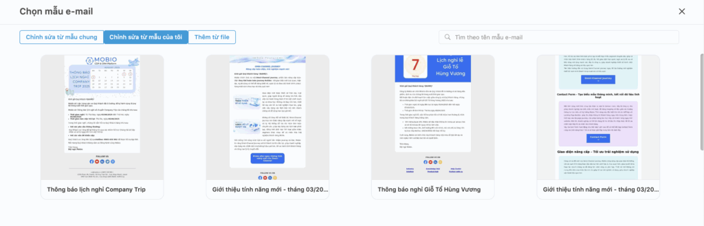 + Chỉnh sửa từ mẫu chung: Là những mẫu mà Mobio đã tạo sẵn, cho phép người dùng dựa trên mẫu có sẵn này, chỉnh sửa tạo mẫu email mới theo tùy chỉnh.