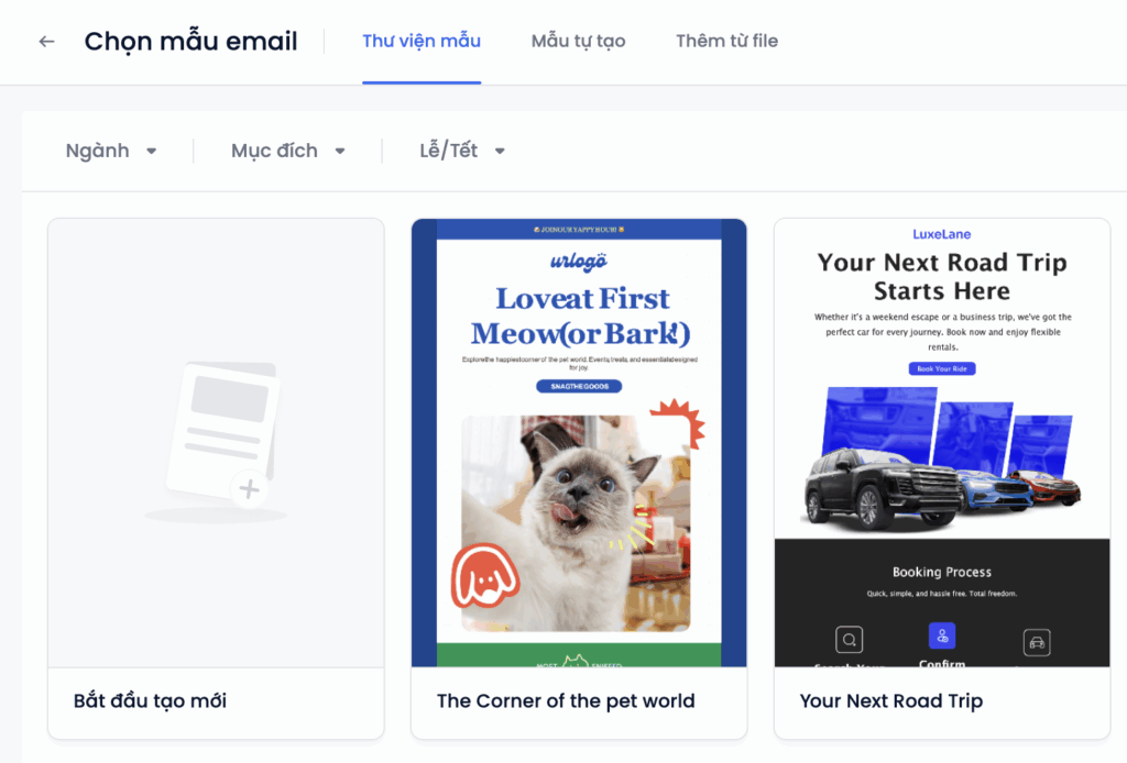 Ngoài việc chọn mẫu email có sẵn, người dùng cũng có thể tạo email mới từ trang trắng bằng cách chọn Mẫu tự tạo > Bắt đầu tạo mới.