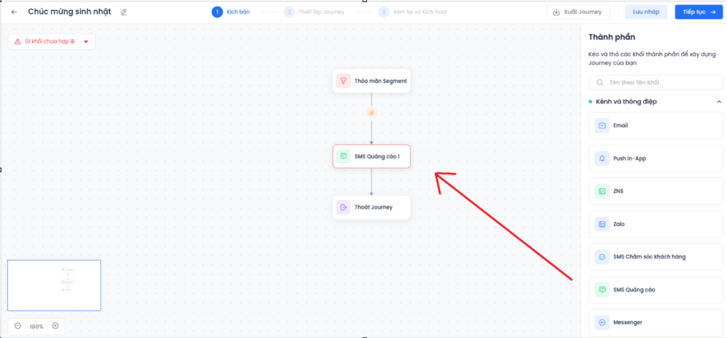 Bước 1: Kéo thả khối kênh SMS Quảng cáo vào kịch bản sau khi đã chọn được Đối tượng mục tiêu.