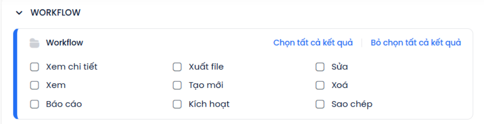 Kết thúc: Thực hiện khi Workflow đang Hoạt động. Workflow đã kết thúc chỉ có thể Xem chi tiết hoặc Sao chép, không thể kích hoạt lại.