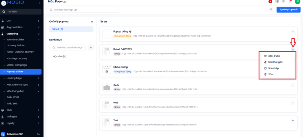 - Sao chép: Cho phép người dùng sao chép và chỉnh sửa mẫu Pop-up vừa sao chép.