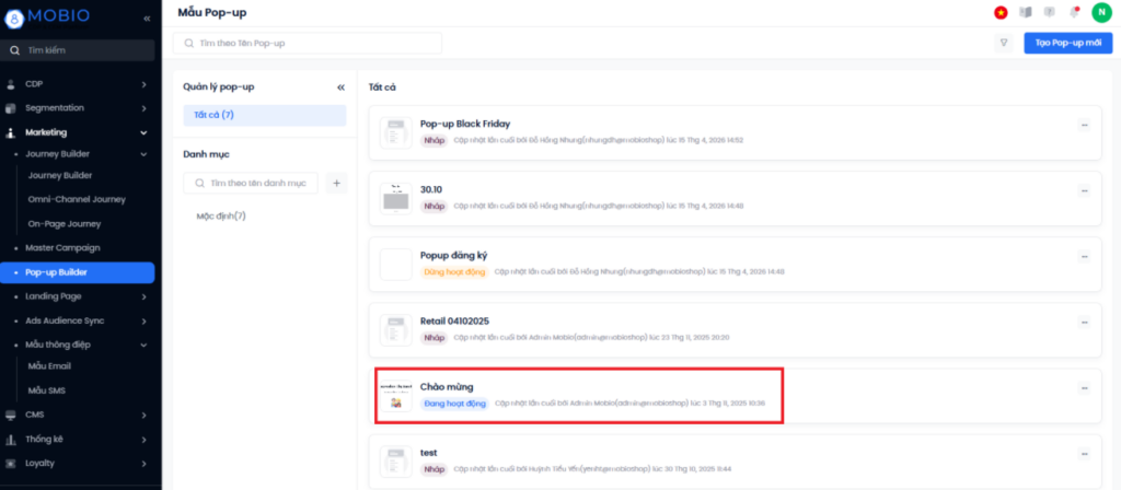 - Mục đích: Hướng dẫn cách quản lý một Pop-up sau khi đã tạo xong, bao gồm các thao tác chỉnh sửa, kích hoạt hoặc xóa trên hệ thống, kèm theo việc theo dõi hiệu suất qua báo cáo thống kê.