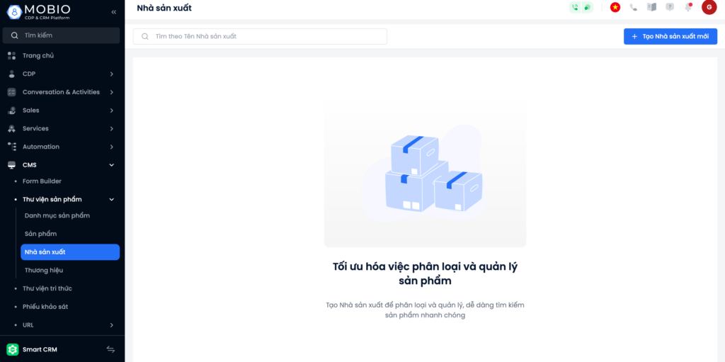 Để thêm nhà sản xuất, vào mục CMS → Thư viện sản phẩm → Nhà sản xuất.