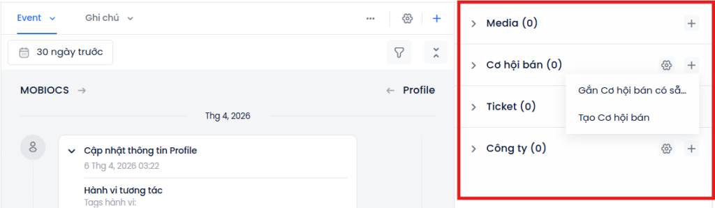 Tạo đối tượng mới: Nhập thông tin để tạo mới hoàn toàn đối tượng trên hệ thống → hệ thống sẽ tự động gắn vào Profile hiện tại sau khi lưu.