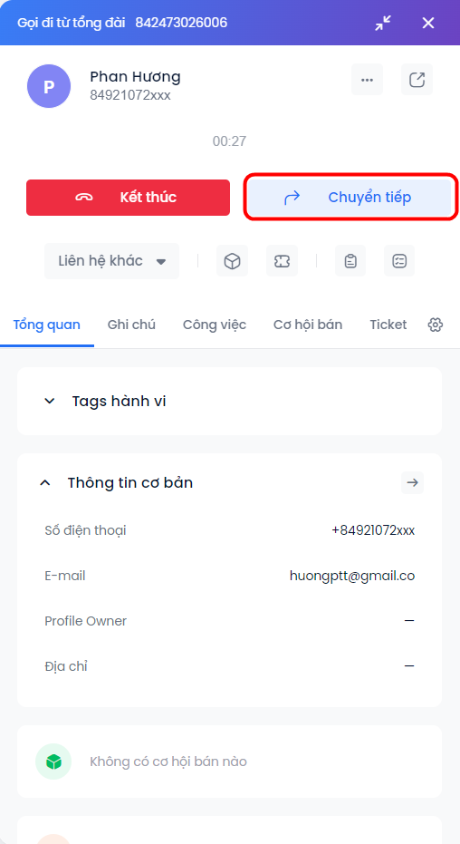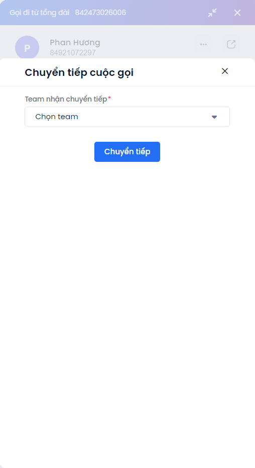 Trong cuộc gọi với khách hàng có thể chuyển tiếp cuộc gọi bấm Chuyển tiếp giao diện hiển thị cửa sổ Chuyển tiếp cuộc gọi, bấm chọn Team nhận chuyển tiếp.