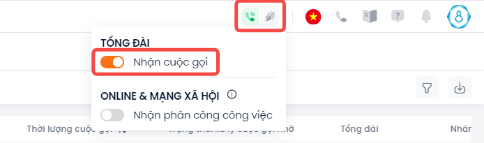 • Sau khi kết thúc ca làm, trước khi đăng xuất khỏi hệ thống hoặc người dùng không muốn tiếp tục nhận cuộc gọi, người dùng cần tắt trạng thái Nhận cuộc gọi.