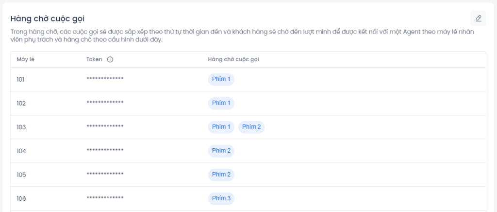 Sau khi cấu hình máy lẻ, tại mục Hàng chờ cuộc gọi, người dùng cần nhập thông tin token và gán phím tương ứng với số máy lẻ của user vừa cấu hình: