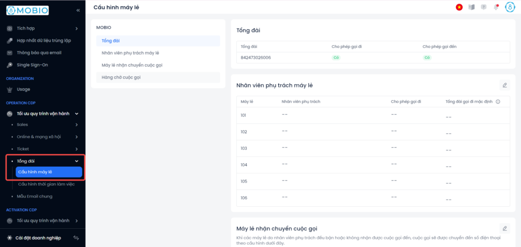 Người dùng có thể tự cấu hình hàng chờ cuộc gọi theo mong muốn tại mục Nhân viên phụ trách máy lẻ và Hàng chờ cuộc gọi: