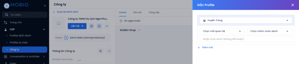Trả lời: Hãy đảm bảo Profile đó đã được tạo trước khi thực hiện thao tác gắn vào công ty. Người dùng cũng có thể tạo mới Profile ngay trong khu vực quản lý người liên hệ.