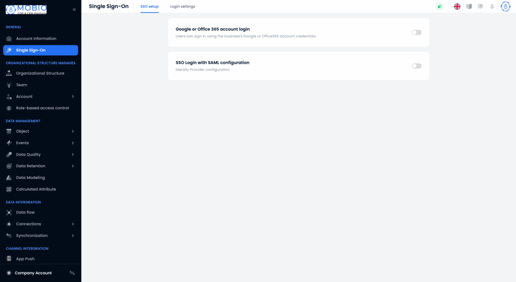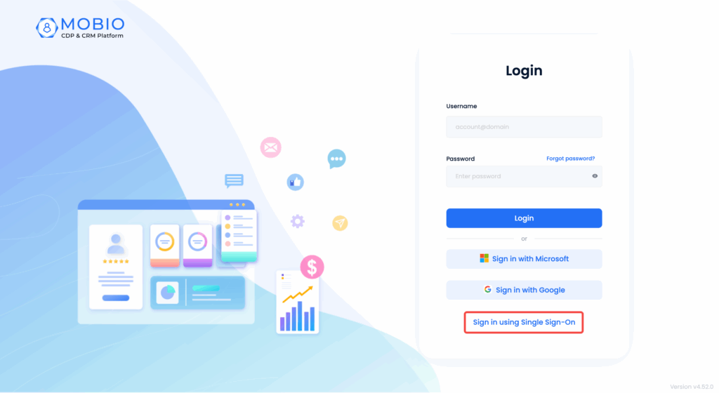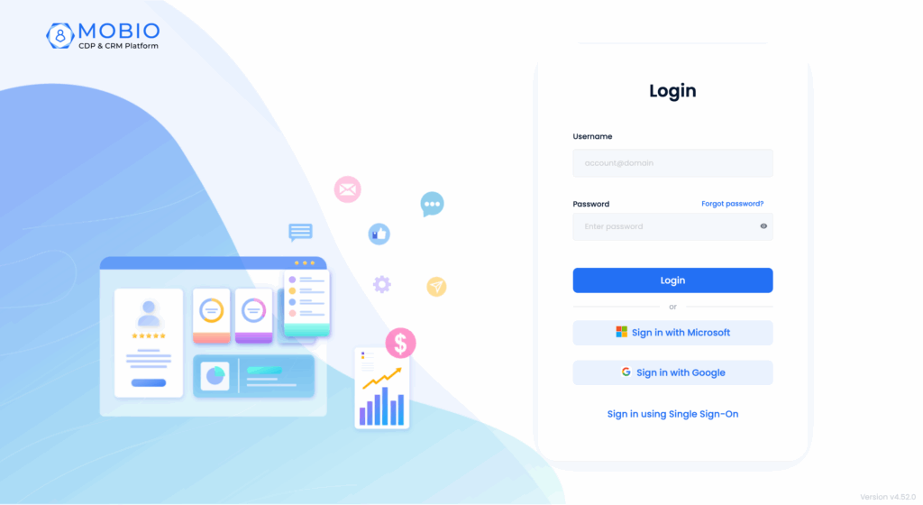 The Single Sign-On (SSO) feature on Mobio CDP is designed to simplify and optimize the login process for employees (staff users) within an organization. With this feature, users no longer need to remember multiple sets of credentials for different systems, reducing risks related to account security.