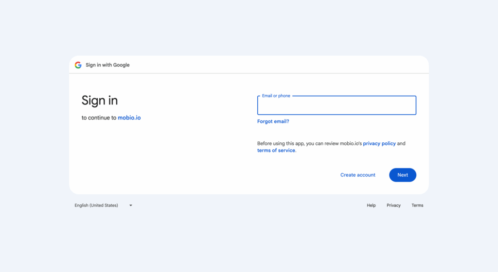 Basic SSO login is a common method that uses user credentials registered with providers such as Google or Microsoft. On the Mobio login screen, users can choose Login with Google or Login with Microsoft.