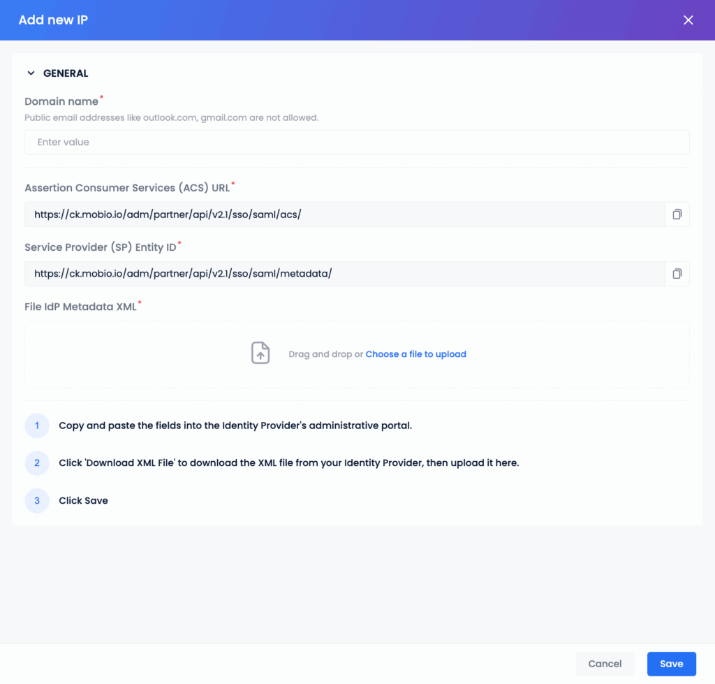 Step 2: In the SAML configuration pop-up, enter the desired integration domain. The system will automatically generate two fields:
