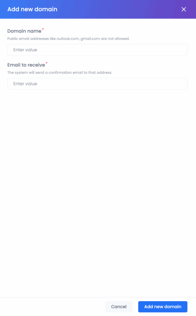 Public domains such as gmail.com, outlook.com.vn, yahoo.com, etc. are not accepted.