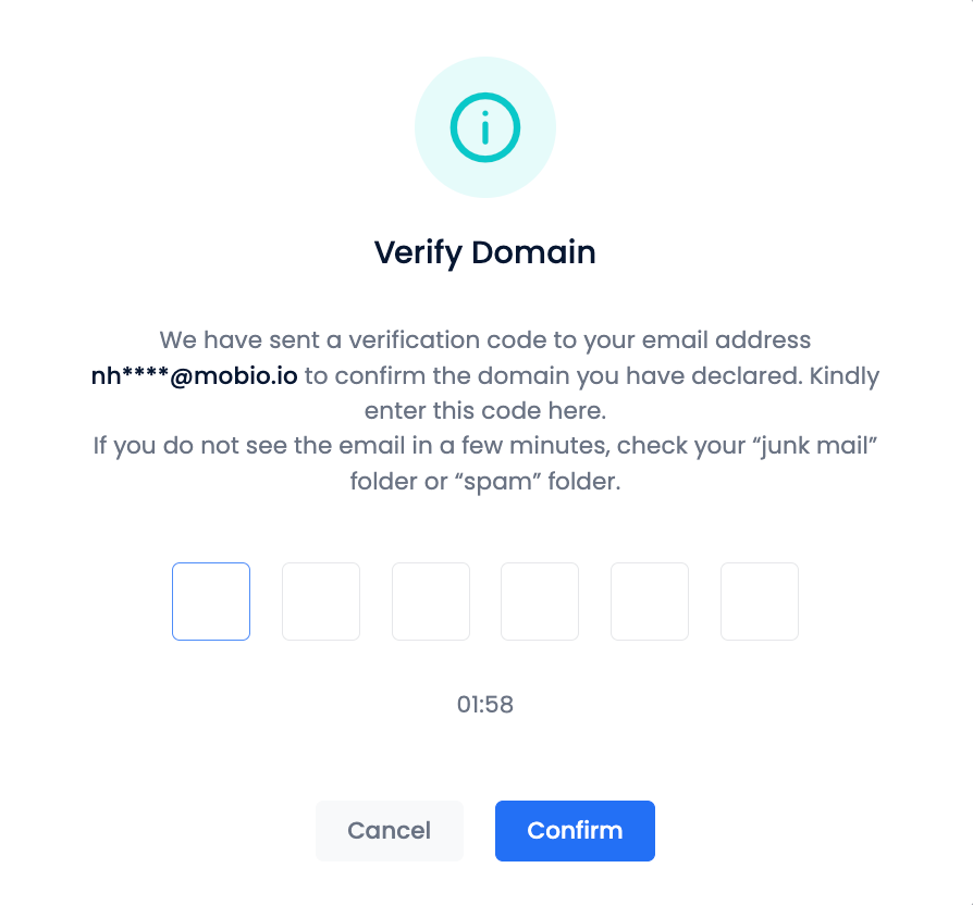 Step 4: The system sends a verification code to the registered email address. Enter the verification code → click Confirm.