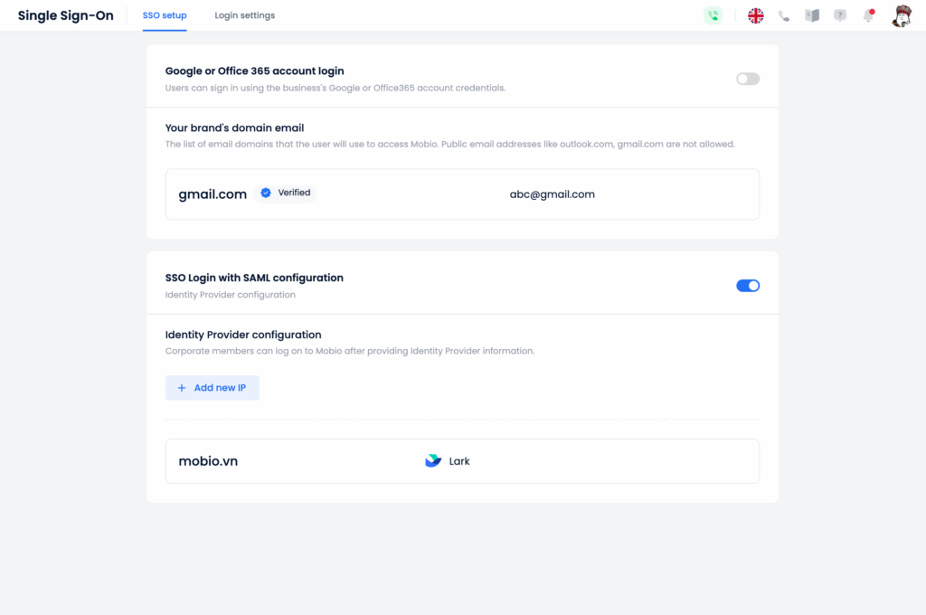 Mobio CDP supports integration with popular Identity and Access Management (IAM) systems such as Google, Microsoft, Lark, or any provider that supports the SAML standard. This enables organizations to better control authentication and access management while ensuring both convenience and security for users.