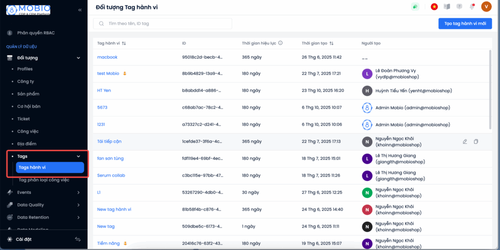 - Thời gian hiệu lực mặc định của hệ thống là 365 ngày. Người dùng có thể thay đổi thời gian hiệu lực mặc định của tag ở Cài đặt doanh nghiệp → Đối tượng → Tag hành vi.