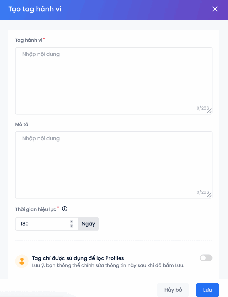 - Thời gian hiệu lực: Thời gian hiệu lực của một tag hành vi được tính riêng theo từng Profile, bắt đầu từ thời điểm Profile được gắn/ tương tác với tag này.