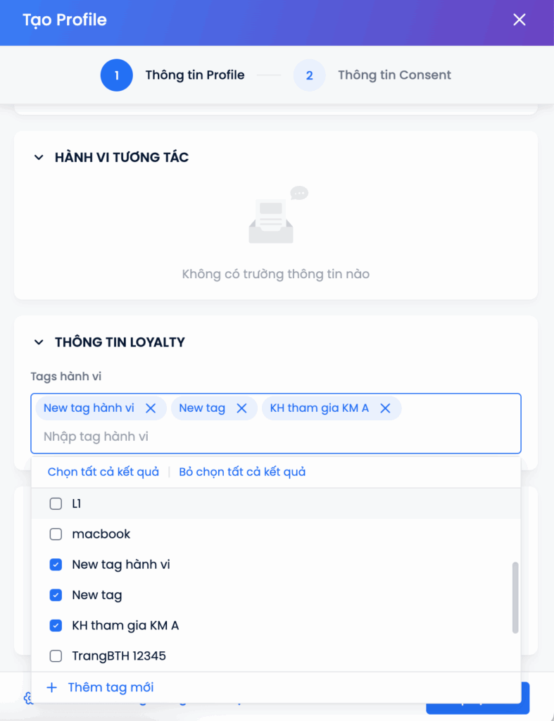 Người dùng có thể gắn tag hành vi trên CDP khi thêm mới hoặc sửa Profile.