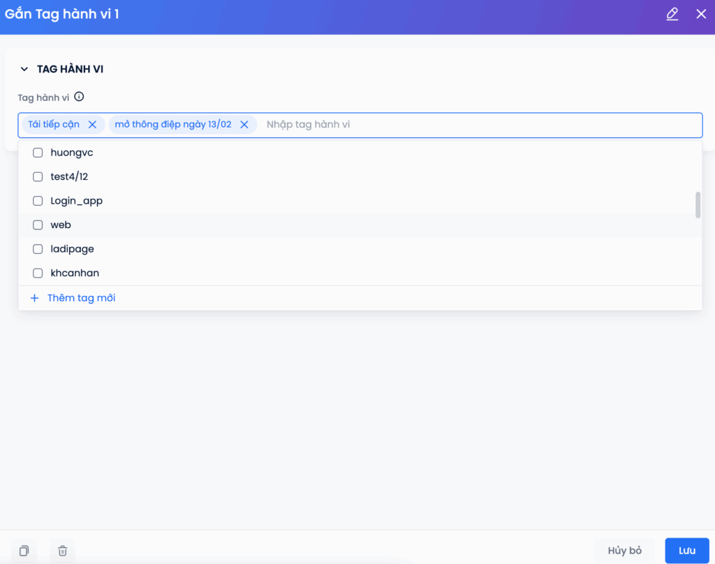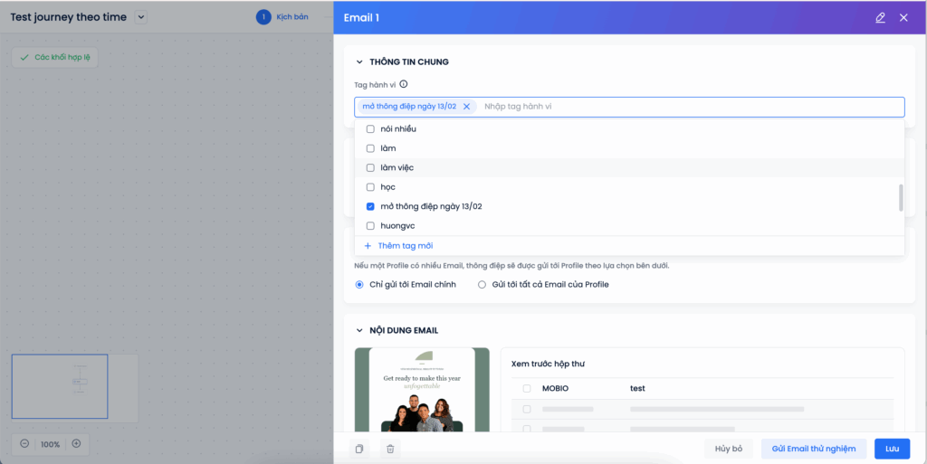 Người dùng có thể gắn tag hành vi trên màn hình cấu hình các khối thông điệp như Email, Push-in-app, Web-push, SMS,… Profile khi mở các thông điệp này sẽ tự động được gắn tag hành vi.