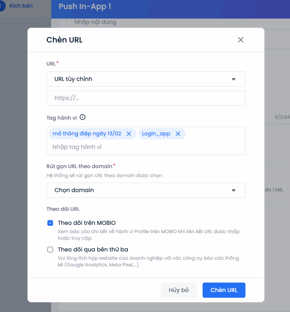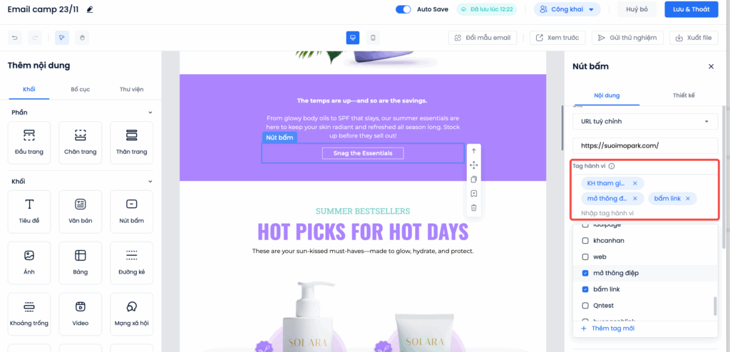 Người dùng có thể gắn tag hành vi trong nội dung bên trong khối thông điệp, ví dụ như: Button kêu gọi CTA hoặc đường Link dẫn đính kèm trong thông điệp. Khách hàng khi bấm Button CTA hoặc bấm Link sẽ được tự động gắn tag hành vi.