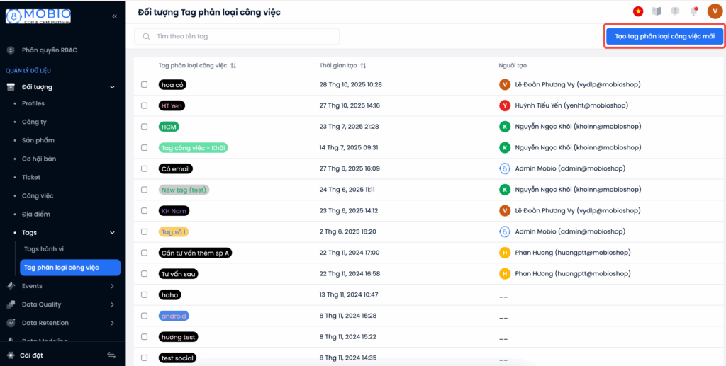Bước 1: Truy cập Đối tượng → Chọn Tags → Chọn Tag phân loại công việc.