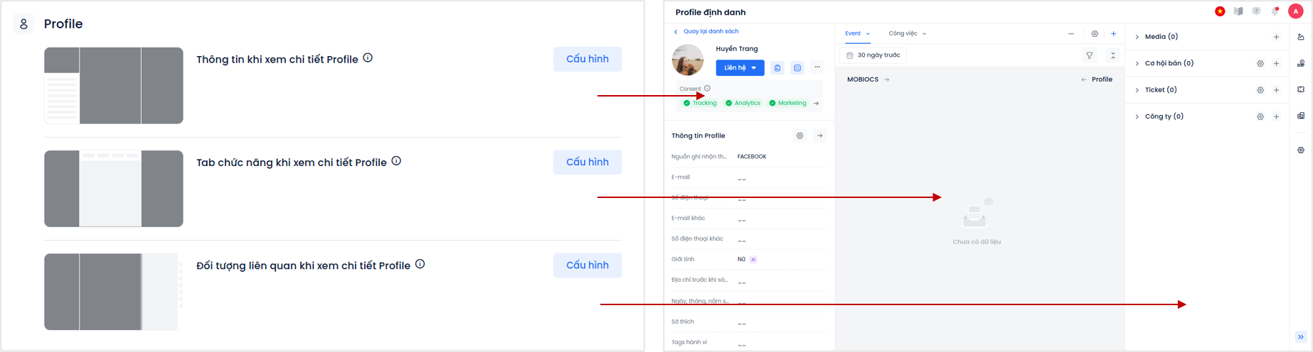 Tính năng này cho phép người dùng tùy chỉnh màn hình làm việc và lựa chọn các trường thông tin/tab dữ liệu hiển thị bên trong giao diện xem chi tiết của các đối tượng (Profile, Công ty, Cơ hội bán, Ticket, Mạng xã hội).